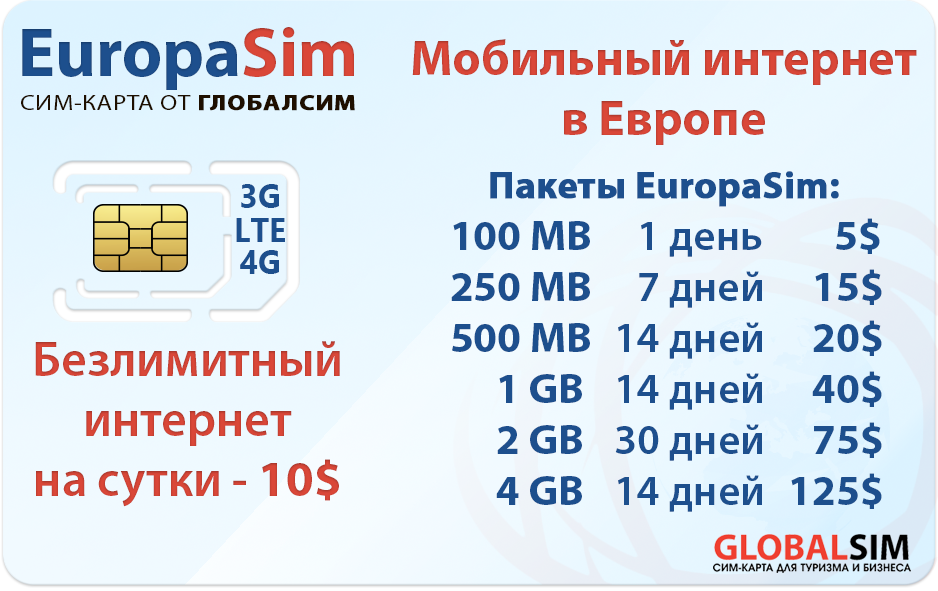 - Тариф EuropaSim от Глобалсим обеспечит безлимитным трафиком в Европе по оптимальной цене (0,02 доллара за мегабайт в пакете).