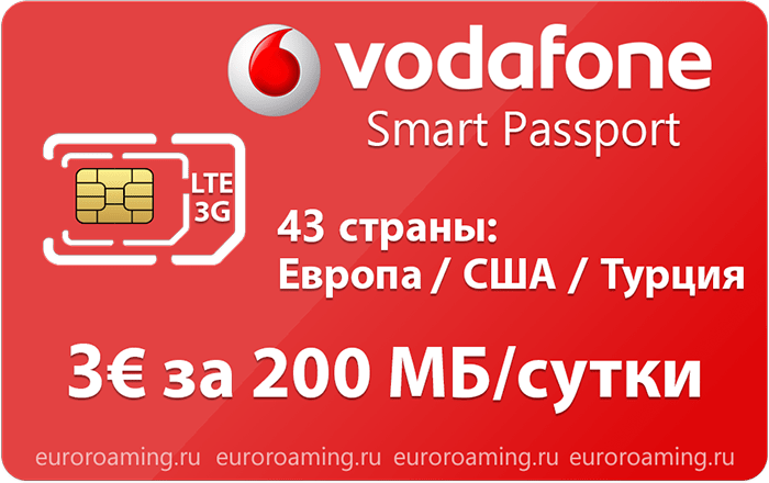 - Оператор Водафон предлагает ещё больше стран для вас. А также больше мобильного интернета. За 3 евро вы получите 200 МБ и по 30 минут на все виды разговоров.